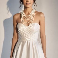 - Ornate Crystal Accent: A vintage-style floral side brooch adds a touch of “Great Gatsby” era sparkle.