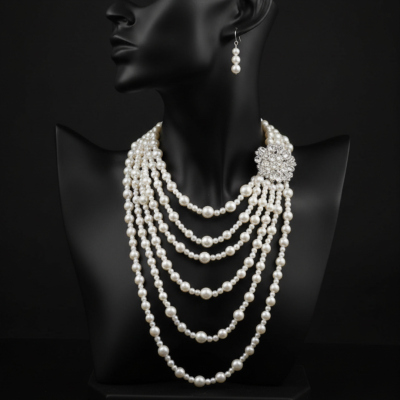 Elevate your formal attire with this breathtaking ensemble. The necklace features multiple cascading tiers of creamy white pearls, meticulously arranged to create a rich, “waterfall” effect. A large, ornate floral brooch encrusted with shimmering crystals sits elegantly to the side, serving as both a functional clasp and a striking focal point.