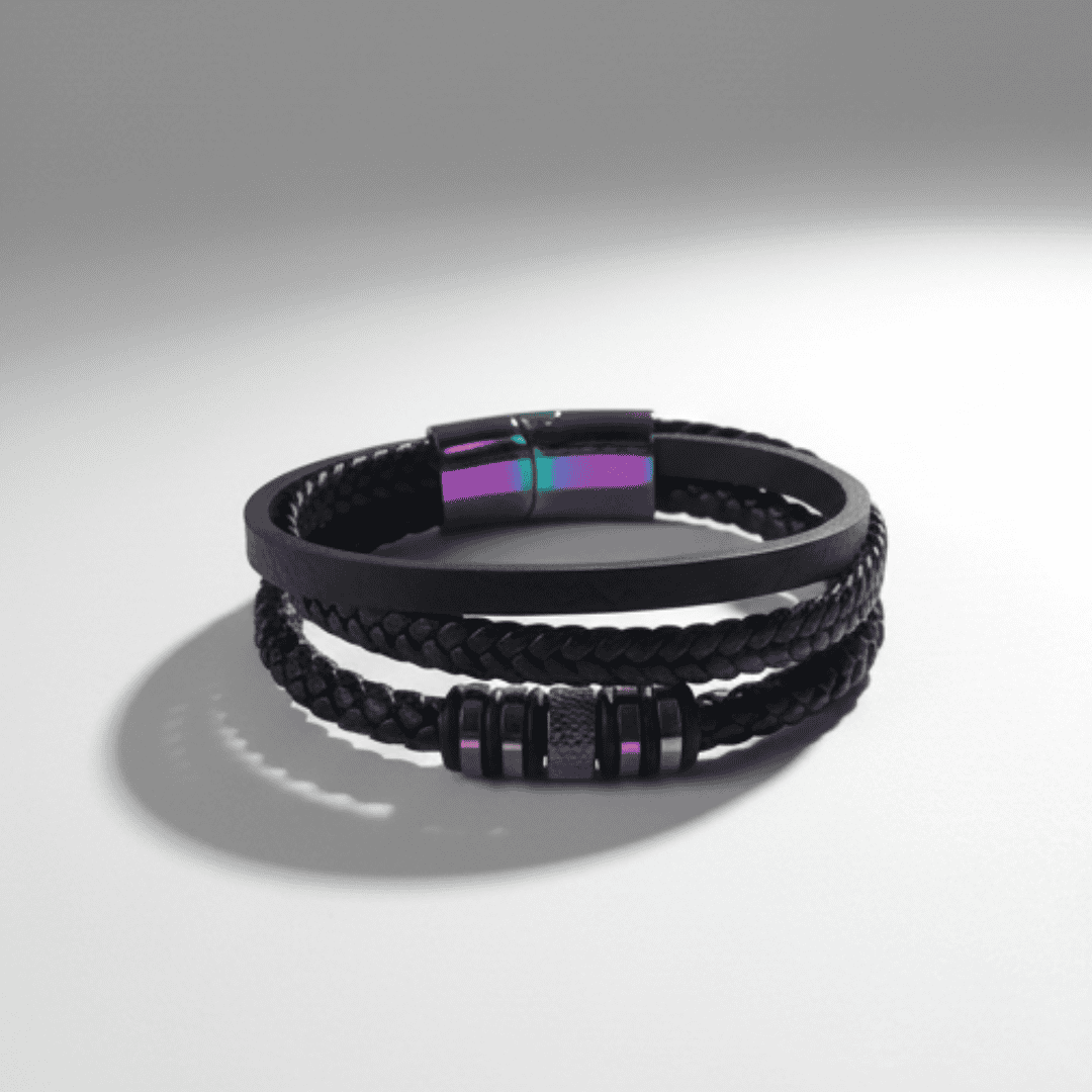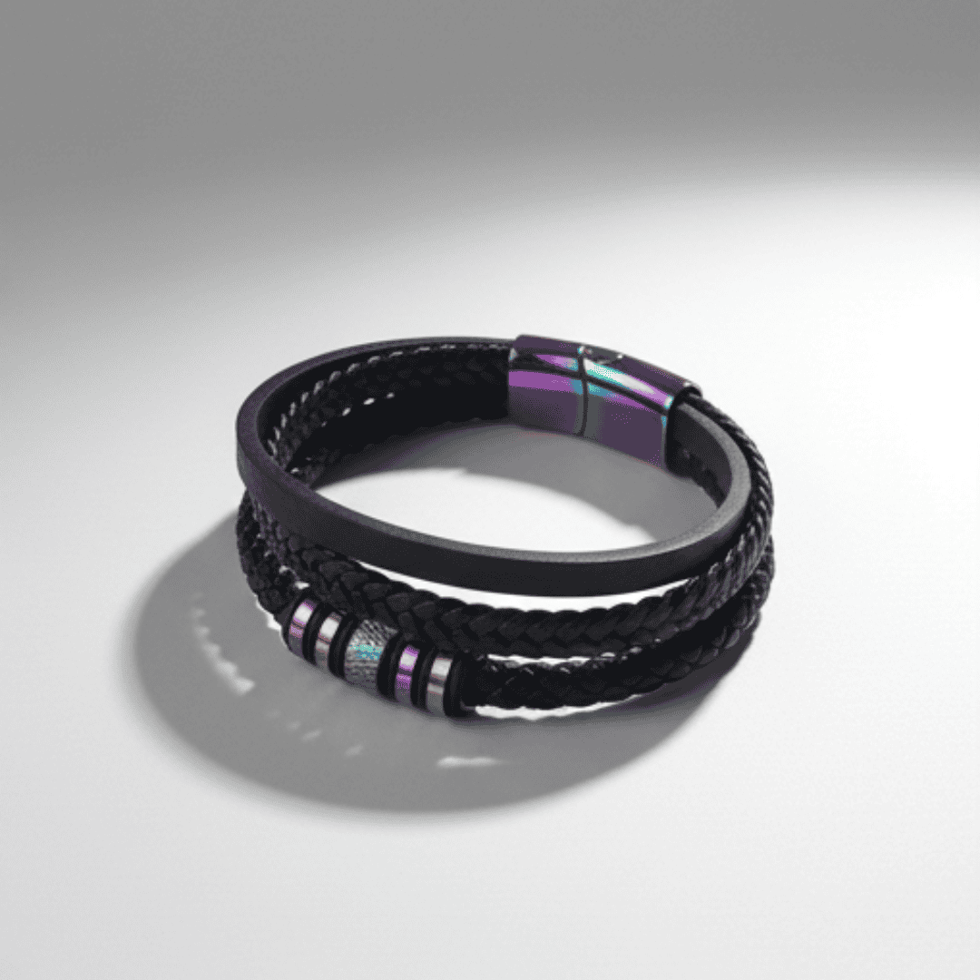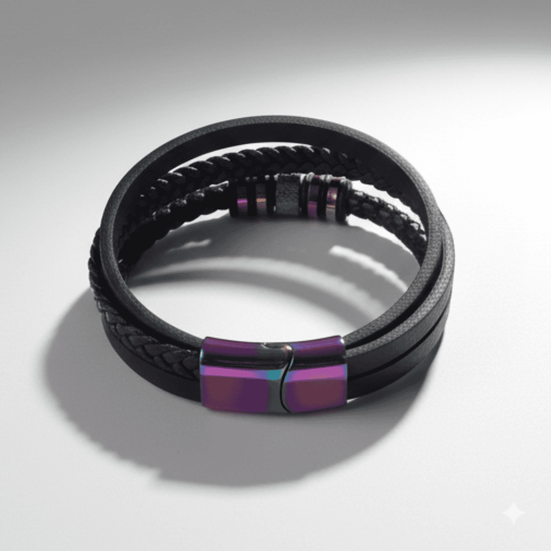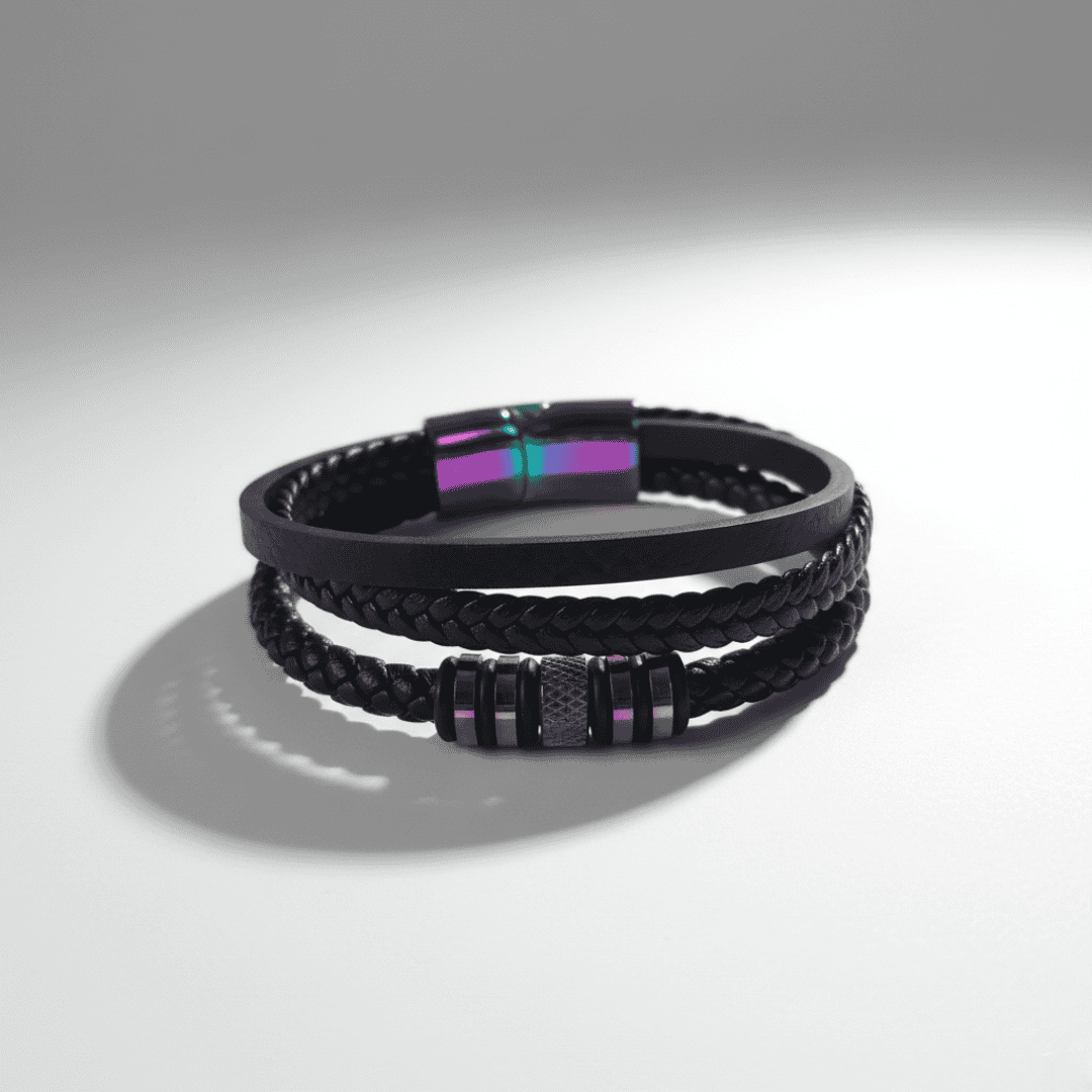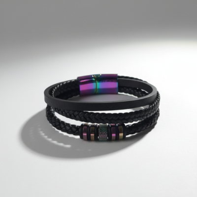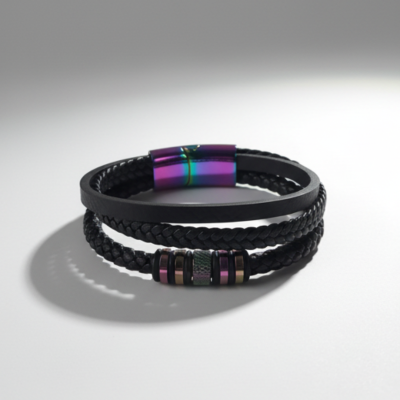 Unleash your inner edge with Auric, a bold fusion of modern masculinity and mystic charm. Crafted with premium braided leather and accented by a radiant aurora-finish clasp, this bracelet is designed to elevate every look — from casual to classy. Its free-size design ensures a perfect fit for him, while the intricate detailing and iridescent metal accents add a touch of mystery and sophistication.