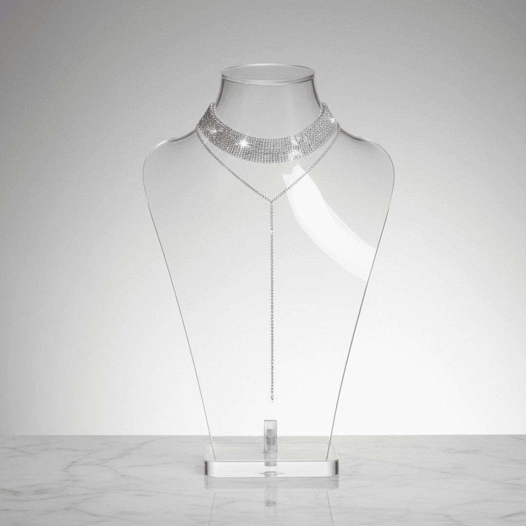 Lariat (Lower Layer): A long, slender chain drop extends vertically from the center-front of the choker, creating a “drip” or lariat effect. This drop typically ends in a small metal accent, enhancing the deep V-neckline.