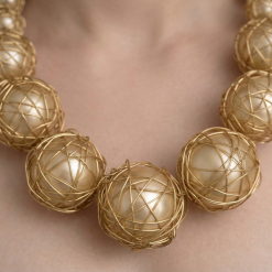 Make a celestial statement with the Celestial Orbit Wire-Wrapped Necklace. This avant-garde piece features oversized, lustrous pearls encased in an intricate web of hand-woven gold-tone wire. Designed to mimic the beauty of planets caught in orbit, the necklace transitions from delicate smaller spheres at the neckline to dramatic, large-scale globes at the center. It is a fusion of industrial texture and classic elegance, perfect for the woman who views her jewelry as a wearable work of art.