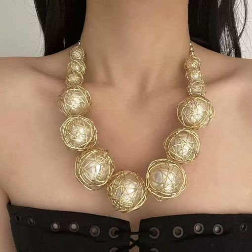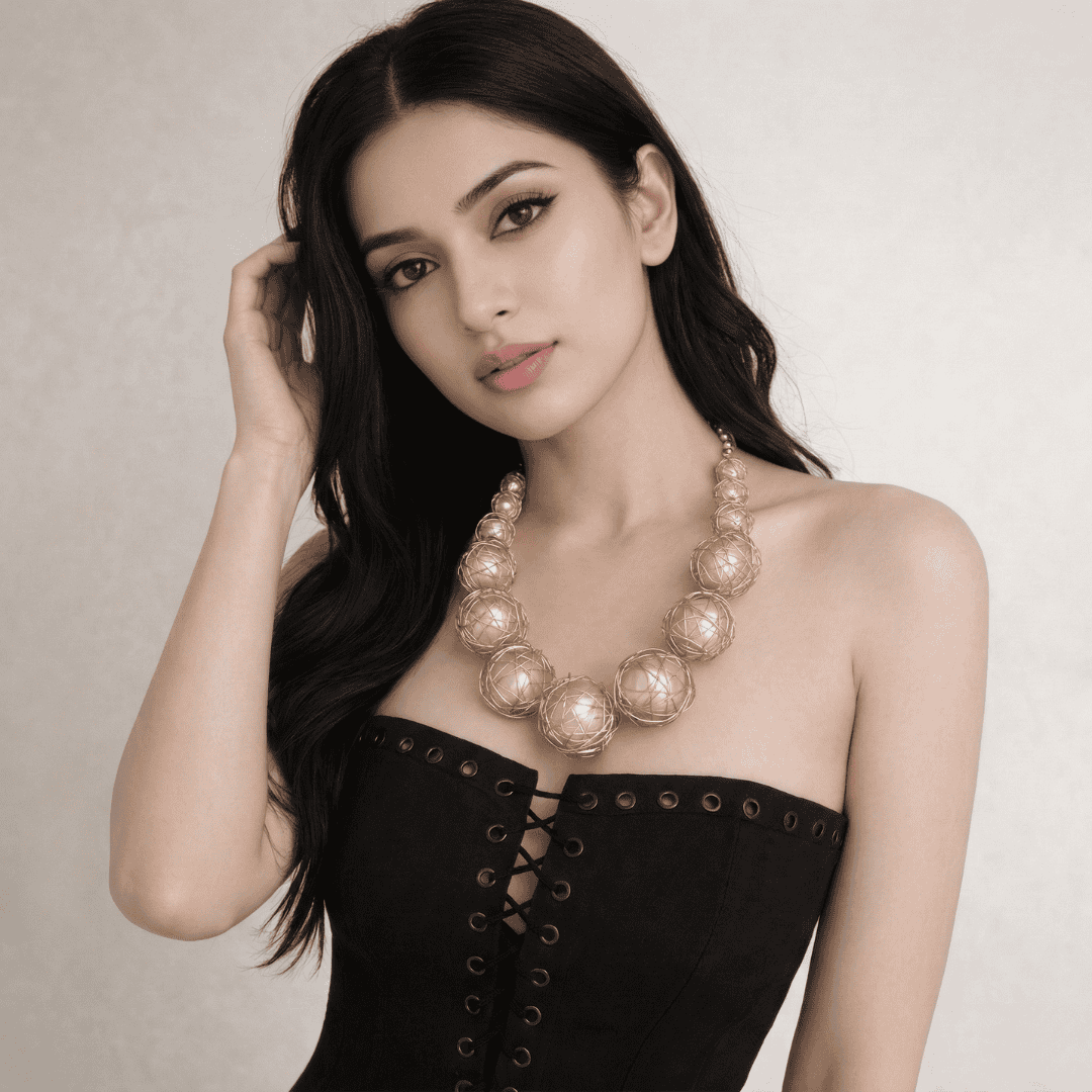 Make a celestial statement with the Celestial Orbit Wire-Wrapped Necklace. This avant-garde piece features oversized, lustrous pearls encased in an intricate web of hand-woven gold-tone wire. Designed to mimic the beauty of planets caught in orbit, the necklace transitions from delicate smaller spheres at the neckline to dramatic, large-scale globes at the center. It is a fusion of industrial texture and classic elegance, perfect for the woman who views her jewelry as a wearable work of art.