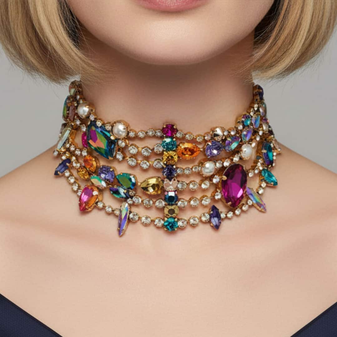 This necklace is designed to sit high on the neckline, making it an ideal choice for formal events, parties, or to instantly elevate a deep-neck or wrap-style outfit.