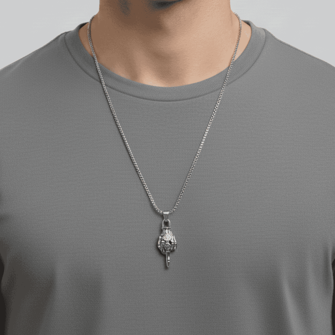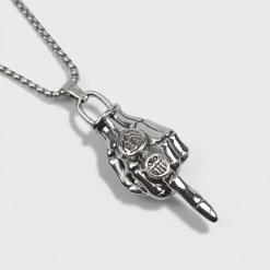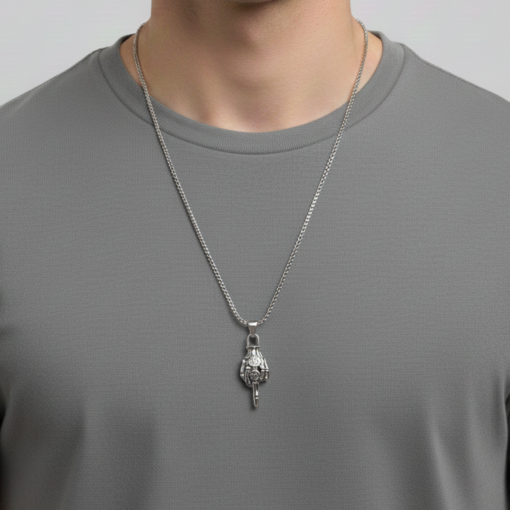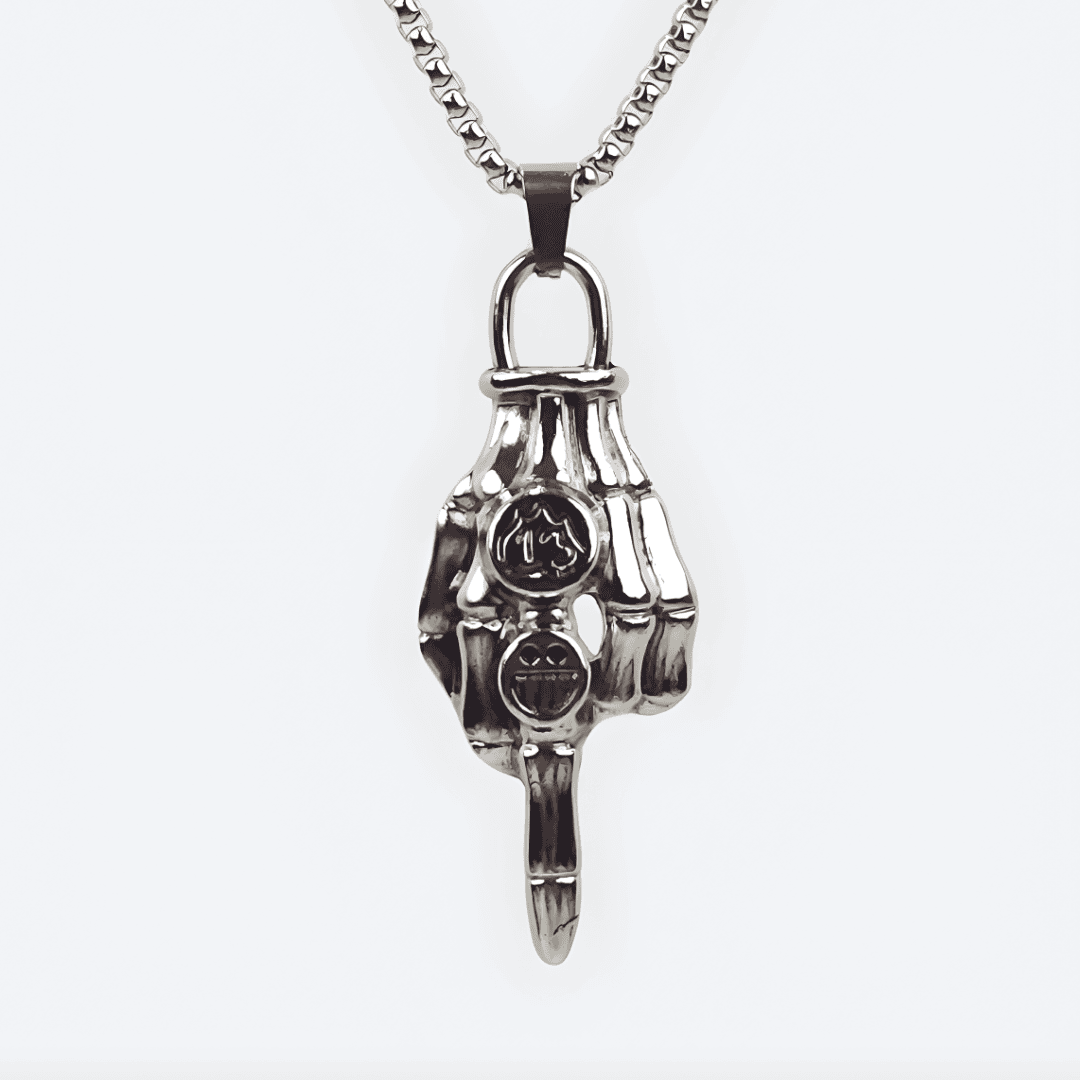 Make a bold statement with our F#ck You Pendant. This isn’t just jewellery; it’s an attitude. Crafted with intricate anatomical detail, this pendant features a polished skeletal hand delivering a defiant gesture. The design is elevated by two unique engravings on the knuckles—a classic “13” and a gritty, stitched-mouth smiley face—blending old-school biker symbolism with modern street wear edge. Whether you’re heading to a concert or just want to add some “rebel energy” to your daily look, this piece is designed to stand out.