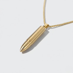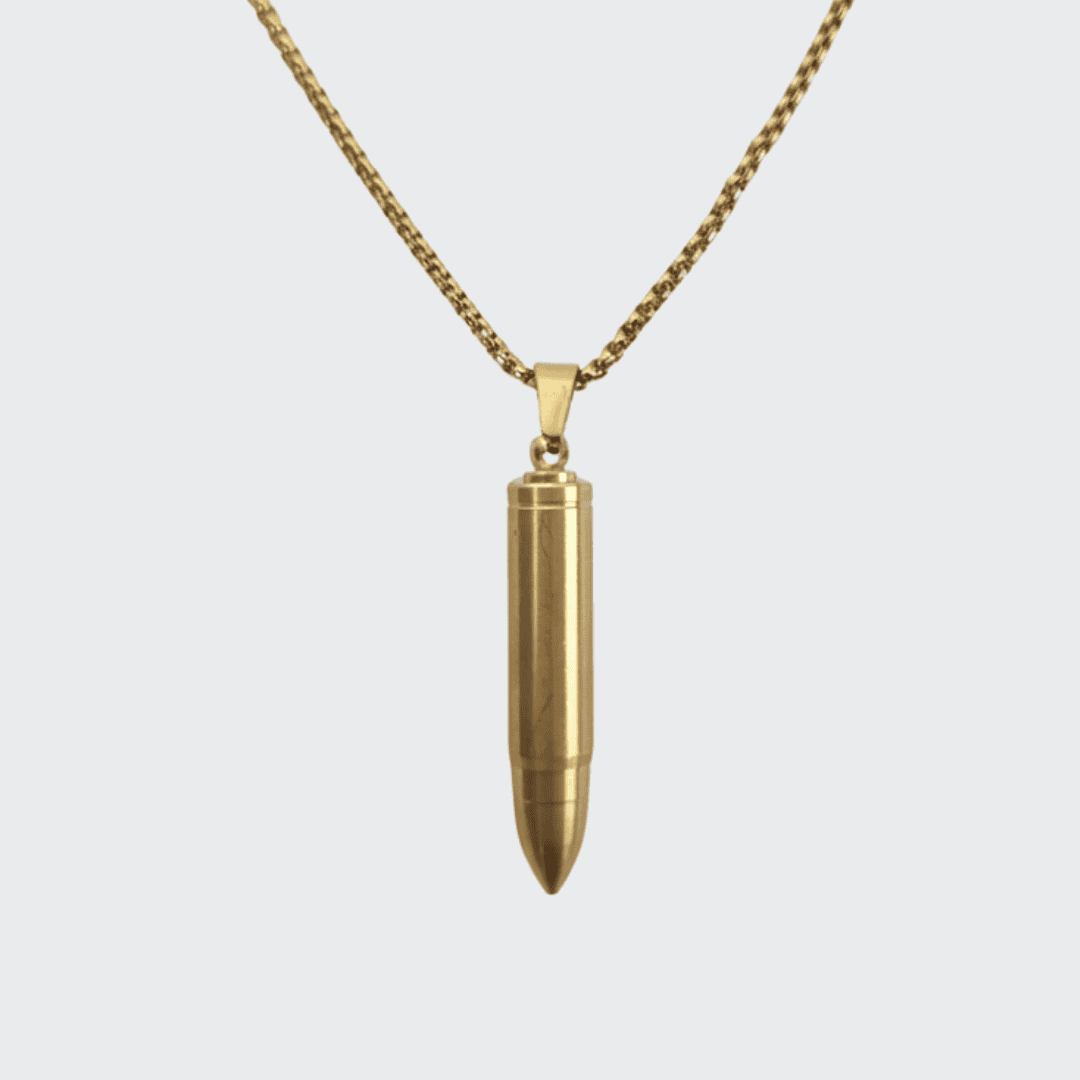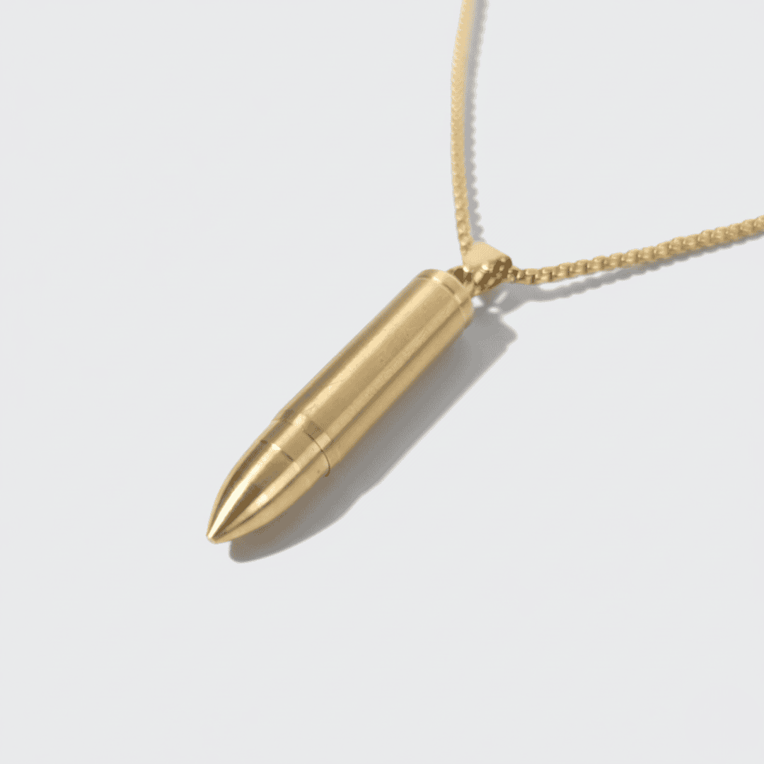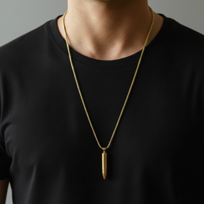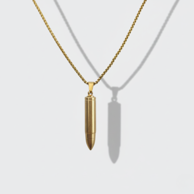 Make a bold yet refined statement with this sleek bullet pendant necklace. Crafted with a smooth, polished metallic finish, the pendant features a realistic bullet-inspired design that symbolizes strength, resilience, and individuality. Its clean lines and warm gold-tone color give it a modern, minimalist appeal that pairs effortlessly with both casual and edgy styles.