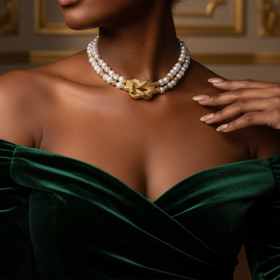 This is a double-strand pearl necklace featuring creamy white, uniform pearls, designed to be worn as a classic choker. The defining feature is a large, central gold-toned clasp crafted in an intricate love knot or Turk’s head knot motif, which is intended to be displayed at the front. This combination offers a sophisticated and striking update to the timeless pearl necklace.