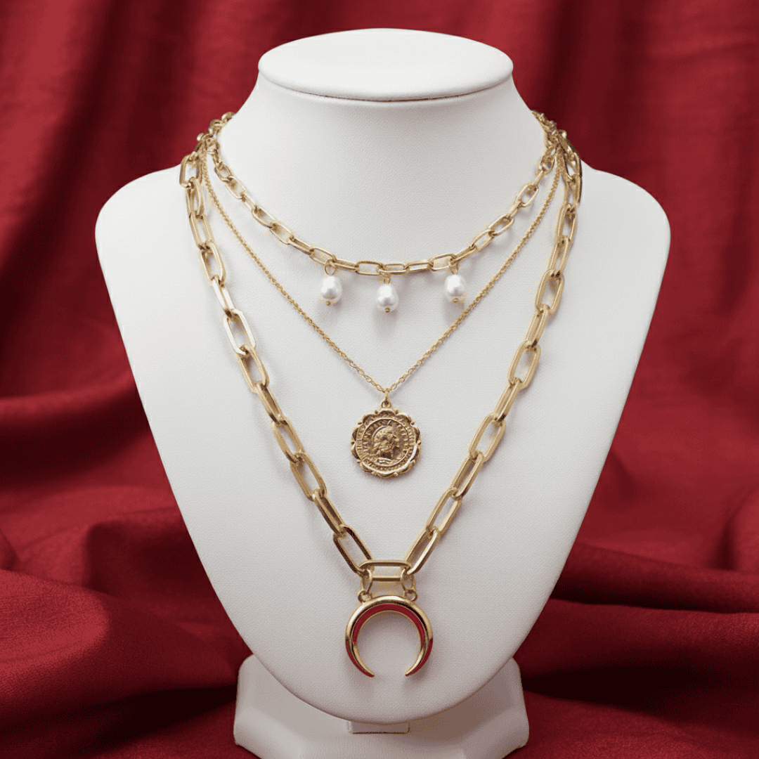 MAJESTICA – Alloy Gold Polish 3 piece necklace with a flower and a crescent moon pendant