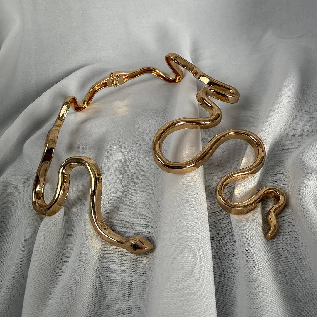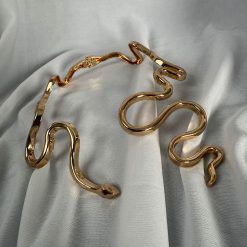 Unleash your inner goddess with the Medyora Necklace, a bold statement piece designed to command attention. Crafted in a fluid silhouette with two striking snake heads meeting in perfect balance, this gold collar necklace embodies power, mystery, and allure.