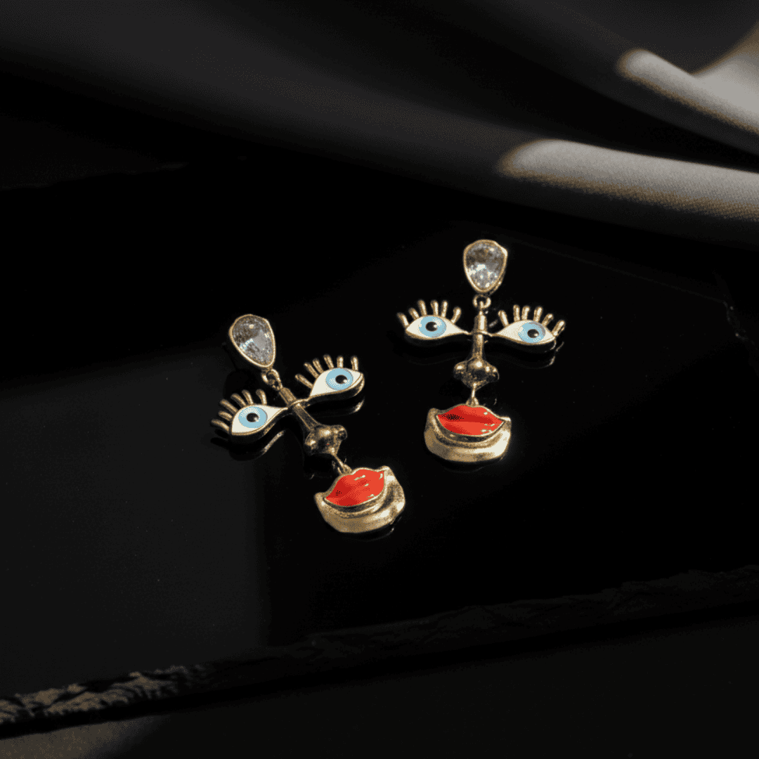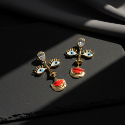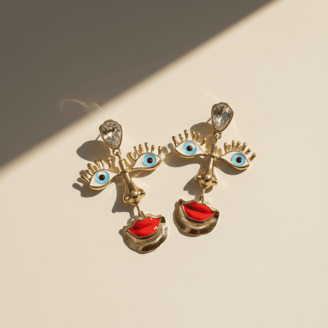 Make a bold artistic statement with these surrealist-inspired abstract face earrings. Crafted in polished gold-tone metal, each earring features a playful yet striking face motif adorned with bright blue eyes, long lashes, a sculpted nose, and bold red lips. This avant-garde design combines fashion and art, perfect for the fashion-forward individual who isn’t afraid to stand out.