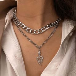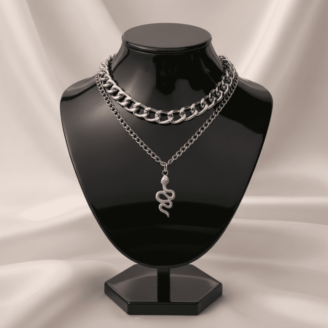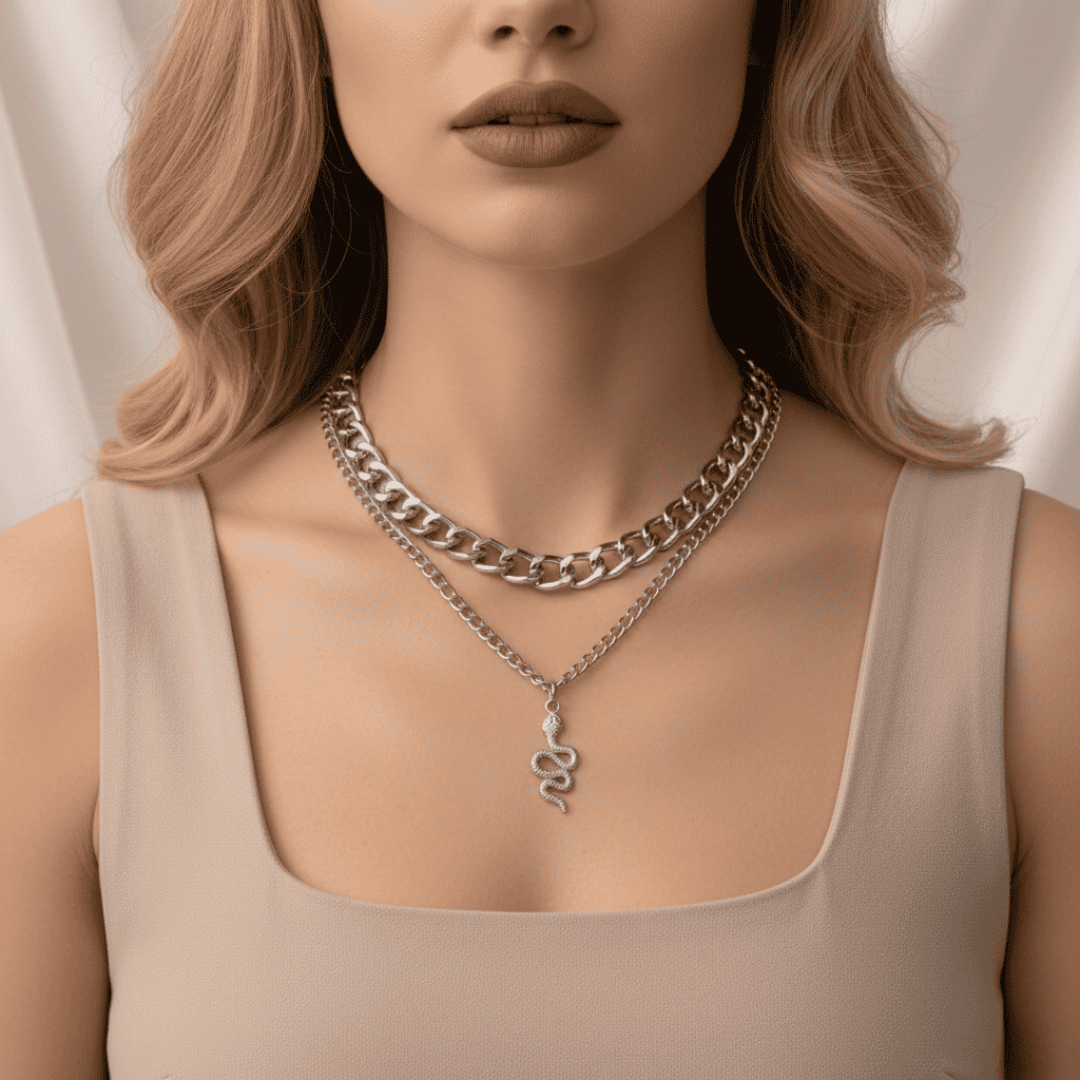 Stunning and gorgeous, NATHAIRA is a two-piece necklace set that is an absolute beauty and a stunning piece for you to make yours. Her charm is a serpent pendant that serves killer looks and grabs the attention of everyone who looks at it.