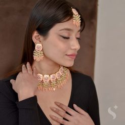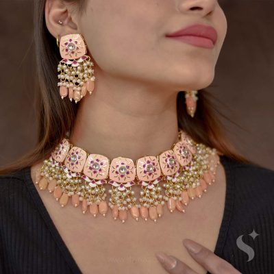 Drenched in pure bliss is this quirky and over-the-top meenakari and enamel choker, earring and maangtika set- NAVYA. Carefully blended and beaded in finest pearls, hand-painted stones, and finest brass, it is a stunning piece from our festive Jaipur collection. It is truly the epitome of tradition integrated into modernism.