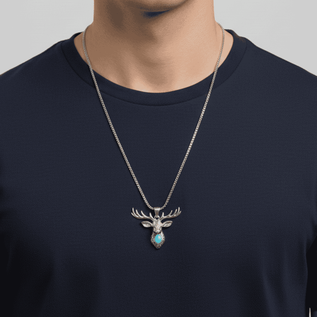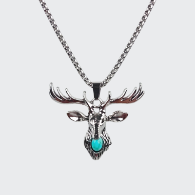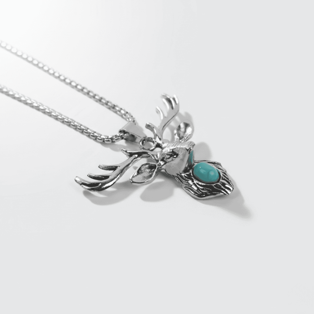 Connect with the spirit of the wilderness with our Azure Ridge Stag Pendant. This piece features a beautifully sculpted reindeer head, complete with expansive antlers that symbolize strength and regeneration. At the heart of the design lies a polished turquoise-style stone, adding a vibrant pop of color against the antiqued silver finish. Whether you’re a lover of nature or a seeker of symbolic totems, this pendant serves as a powerful reminder of grace and resilience in the face of the elements.