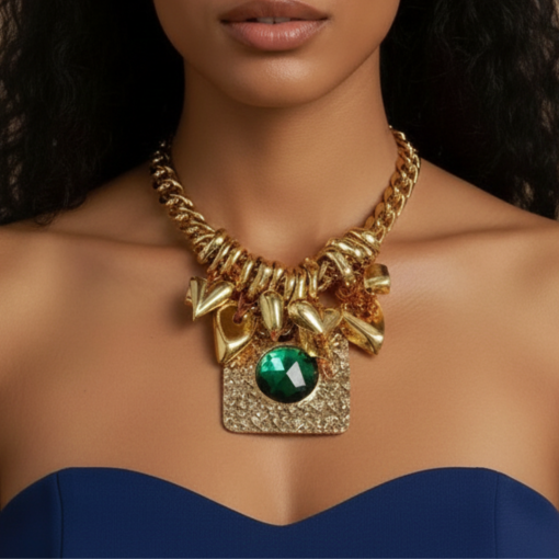 Channel bohemian luxury with the Emerald Heart Hammered Statement Necklace. This eclectic piece features a bold, square pendant with a rugged hammered texture, centered by a brilliant emerald-green crystal that captures the light from every angle. Flanking the central pendant are multiple polished gold-tone heart charms, suspended by rustic twine for a unique, handcrafted feel. Set on a chunky curb chain, this necklace perfectly balances raw, artisanal details with high-shine glamour.