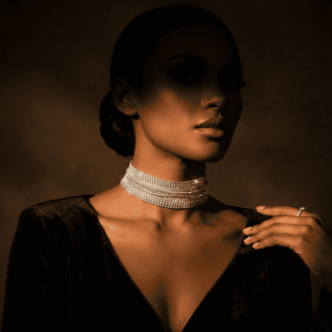 Impact: Creates a blinding, light-catching effect that emphasizes the neckline.