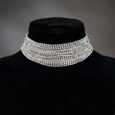 This is a wide, multi-row rhinestone choker necklace designed to deliver maximum brilliance and glamour. The necklace features numerous parallel strands of small, uniformly-sized clear rhinestones set closely together, creating a seamless, intensely sparkling surface that completely covers the width of the choker. The piece is structured to fit snugly around the neck, offering a bold, high-fashion, and luxurious statement.