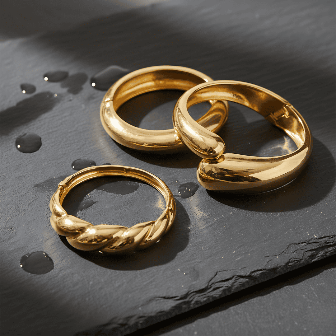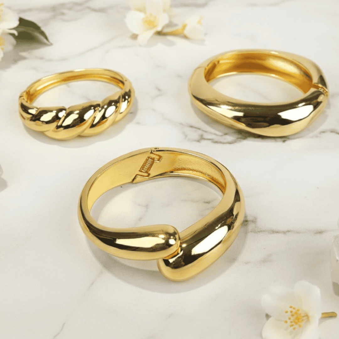 Embrace modern minimalism with the Aura Liquid Gold Sculptural Bangle Set. These high-shine bracelets feature fluid, organic silhouettes that mimic the appearance of molten gold. The collection includes various textures, from smooth, high-polish curves to intricate twisted “croissant” patterns and interlocking drop designs. Crafted with an architectural eye, each piece provides an asymmetrical, ergonomic fit that catches the light beautifully from every angle. Whether worn as a single statement piece or stacked for high-impact.