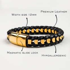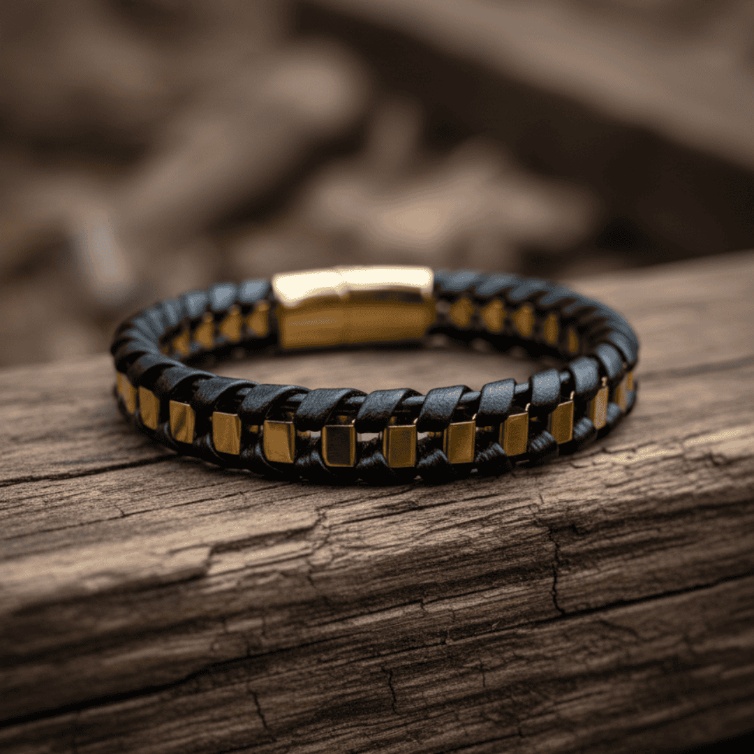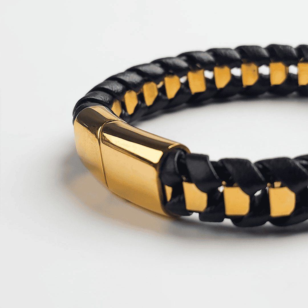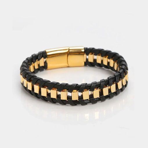 Distinctive bracelet merges rugged texture with sleek luxury, creating a bold accessory for the modern individual. A substantial, braided band featuring a classic black woven leather construction interlaced with geometric, high-polish gold-tone metal accents. The interlocking design creates a captivating, eye-catching pattern.