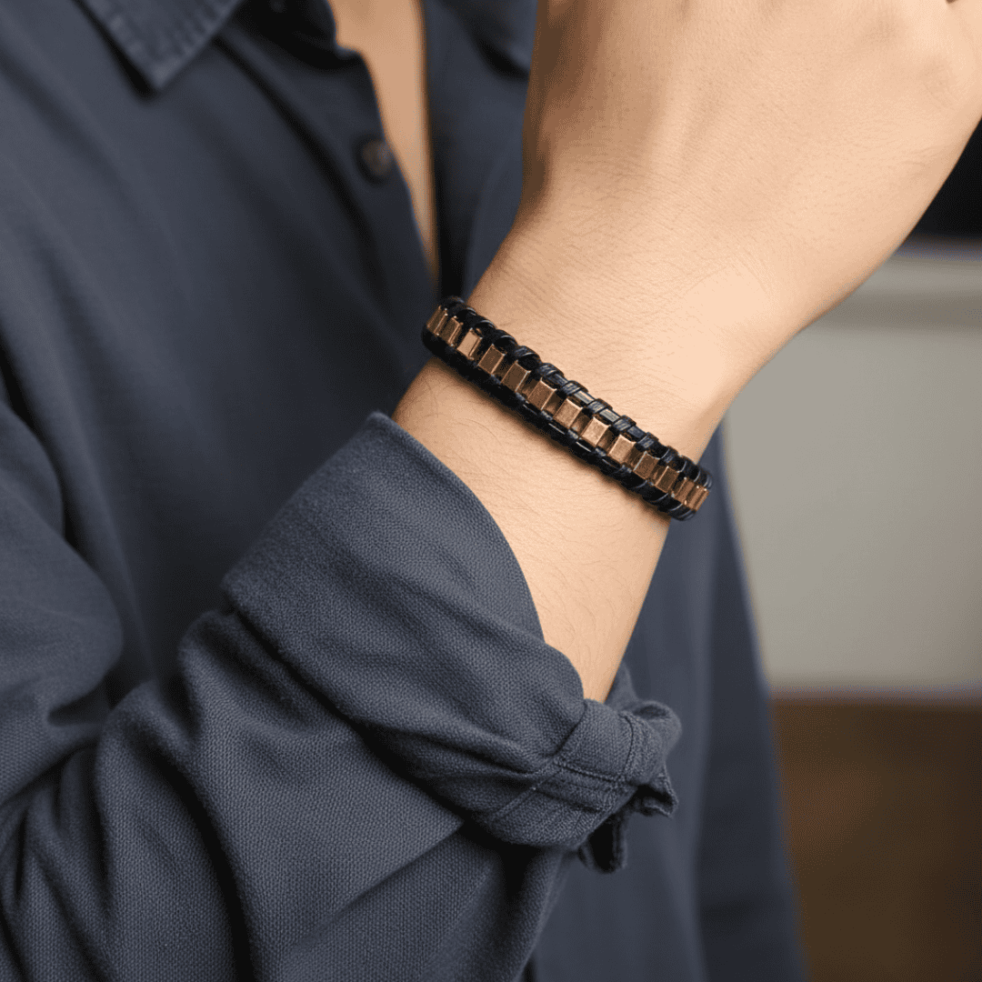 This bracelet works well as a statement piece under the cuff of a charcoal or navy suit, or with sharp, dark-colored trousers and a button-down shirt.
