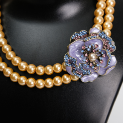 Pair this necklace with a pastel-colored midi dress or a soft floral chiffon gown. The champagne pearls and purple enamel will complement spring and summer palettes perfectly.