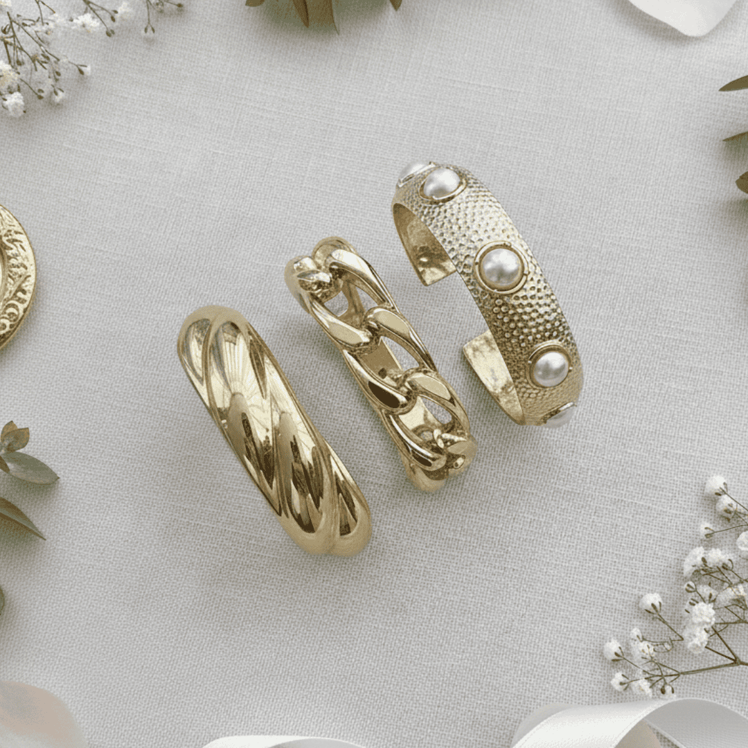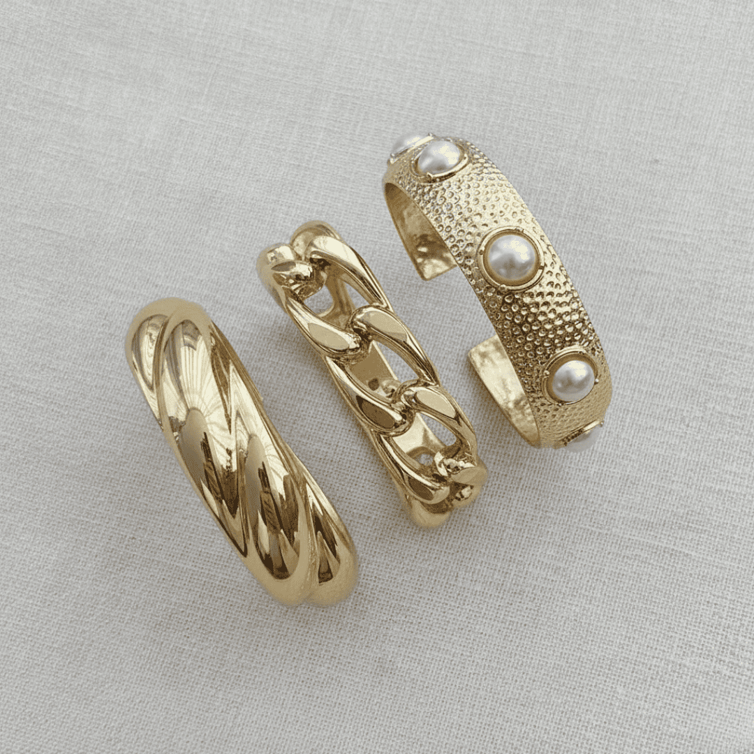 Capture the essence of sun-drenched luxury with the Gilded Reef Statement Bangle Set. This curated stack features three distinct architectural designs: a wide hammered-metal cuff inset with lustrous pearls, a heavy-duty oversized curb link, and a sleek, domed “croissant” style bangle with high-shine ribbing. Together, they create a rich, layered look that balances raw, organic textures with refined elegance. Each piece is designed to catch the light.