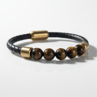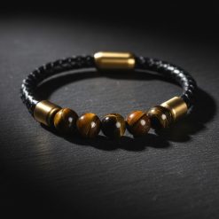 The bracelet features a high-quality braided black leather band paired with matte gold-toned metal accents, giving it a modern and luxurious finish. Each Tiger Eye bead is polished for a flawless shine, ensuring the product stands out beautifully in every look.