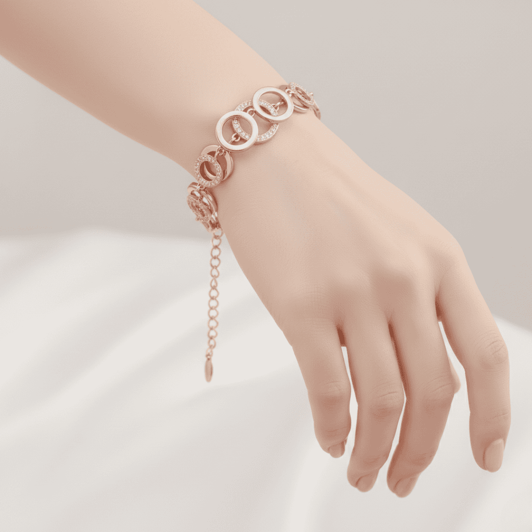 Elegant and attractive, our entwined ring bracelet is here to charm you. Studded with real American Diamonds, Vicious is a graceful ornament to beautify your hands. It is a rose gold designer bracelet made in brass & copper, hence is both stylish and durable article. With a sturdy delicate lock system and beautiful eye-pleasing design, it is a must-have for teenagers and women alike.